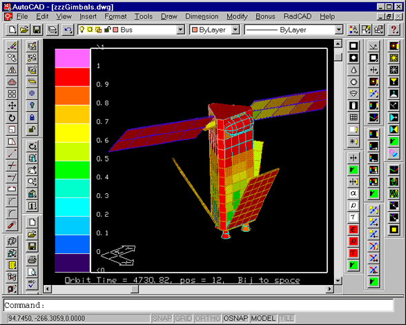 在第12个轨道位置处卫星对空间的辐射交换系数的后处理显示彩图如上,用户能完全控制调色条以及文本栏数据与位置。后处理数据(数据文件名、文本描述等)对每一案例都单独存放,所以能在温度和角系数间快速切换。图标的设置也非常便于模型的动态显示,单击即可转到下一个时间步长数据。RadCAD能完成以下数据的快速处理: