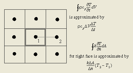 让我们考虑一个简单的例子,以正确认识某一节点的全局能量平衡和节点间存在的单独热流率间的区别。传统的质心方法(centroid approach)以代数式逼近导热方程中的积分项: