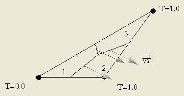 在先前假定的温度下,梯度垂直于右端表面并在单元内保持恒定。温度梯度绘在个节点控制面的中心。定性地,可以看出热的确是从节点3流动到节点1,同样的,热量也从节点2流到节点3,尽管两者处于同一温度。如果这个单元处在大的网络中并且这个梯度实际存在,那么实际上会有热量从这个表面流出。